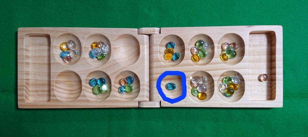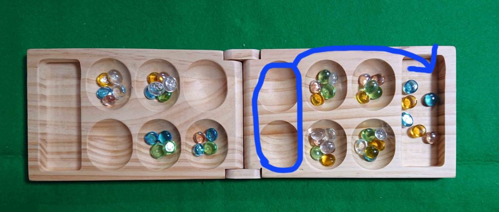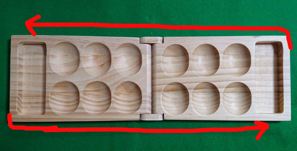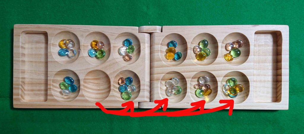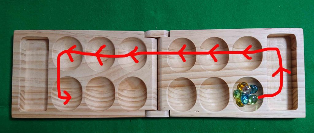 マンカラの石は反時計回りに順番に石を入れていきます。