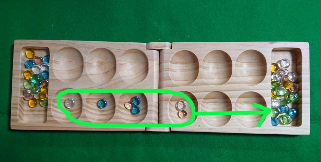 ゲームが終了した時点で、自分の陣地のポケットに石が残っているプレイヤーは、その石すべてを自分のゴールに入れます。