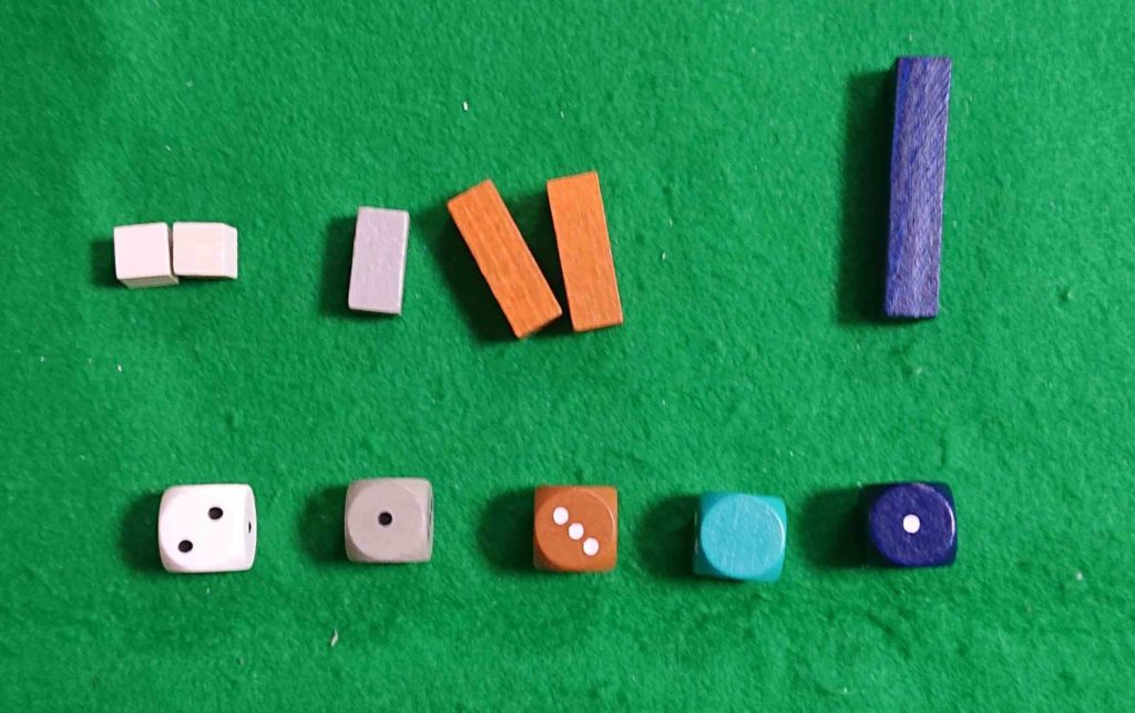また、それに対応した色のサイコロも5個あります。