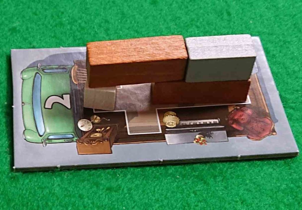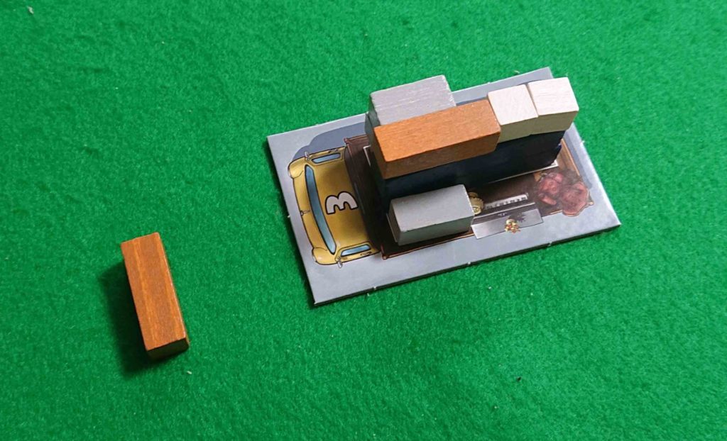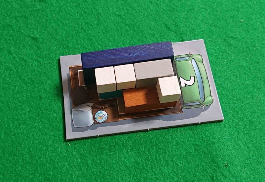 トラックカードにはいろいろなサイズ(積載量)があります。瞬時に判断して早くトラックカードを選びます、1番遅かったプレイヤーはランダムに割り当てられたトラックカードに荷物を積み込む羽目になります。。