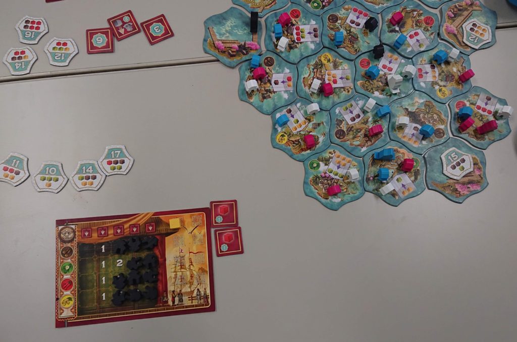 また、交易所を多く配置するとボーナスタイルがもらえます。船が無料で2個進むとか資源を多くもらえるなどの5種類のタイルが早いもの勝ちでもらえます。