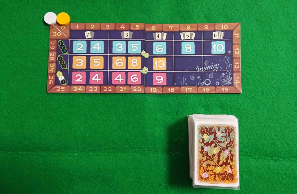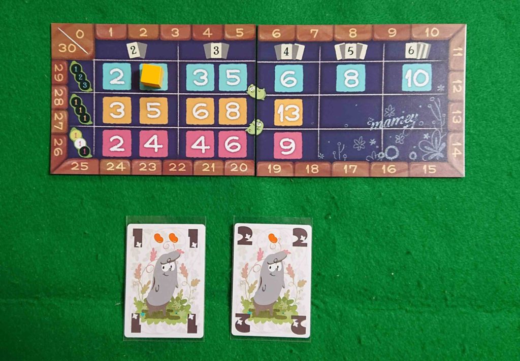 プレイヤーコマを得点表の0の所に置きます。豆カードはよくシャフルして、山札とします。(豆カードは2人の時と3~4人の時では使用枚数が異なります)