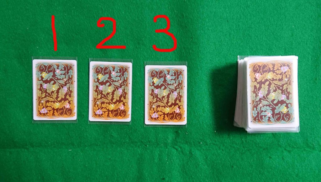 下の写真のように1枚ずつ3列目まで、裏のままのカードを置いていきます。