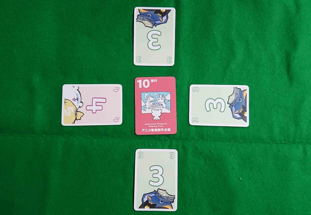 全員がカードを出すか出さないかを決めたら、いっせいにカードを表にします。