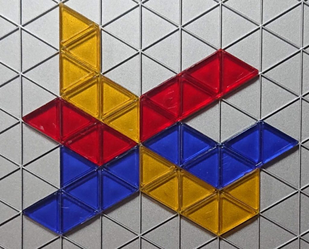 正三角形の集まりのブロックピースを各プレイヤー1個ずつボードに置いていきます。置くときは自分の色のブロックピースの角と角をつなげていきます。