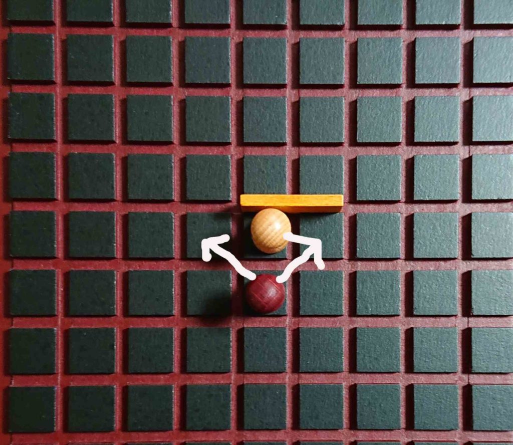 向かい合っていて相手のコマの後ろにブロック用板がある場合には、斜めに移動出来ます。(斜めに移動できるのは、この場合のみです)