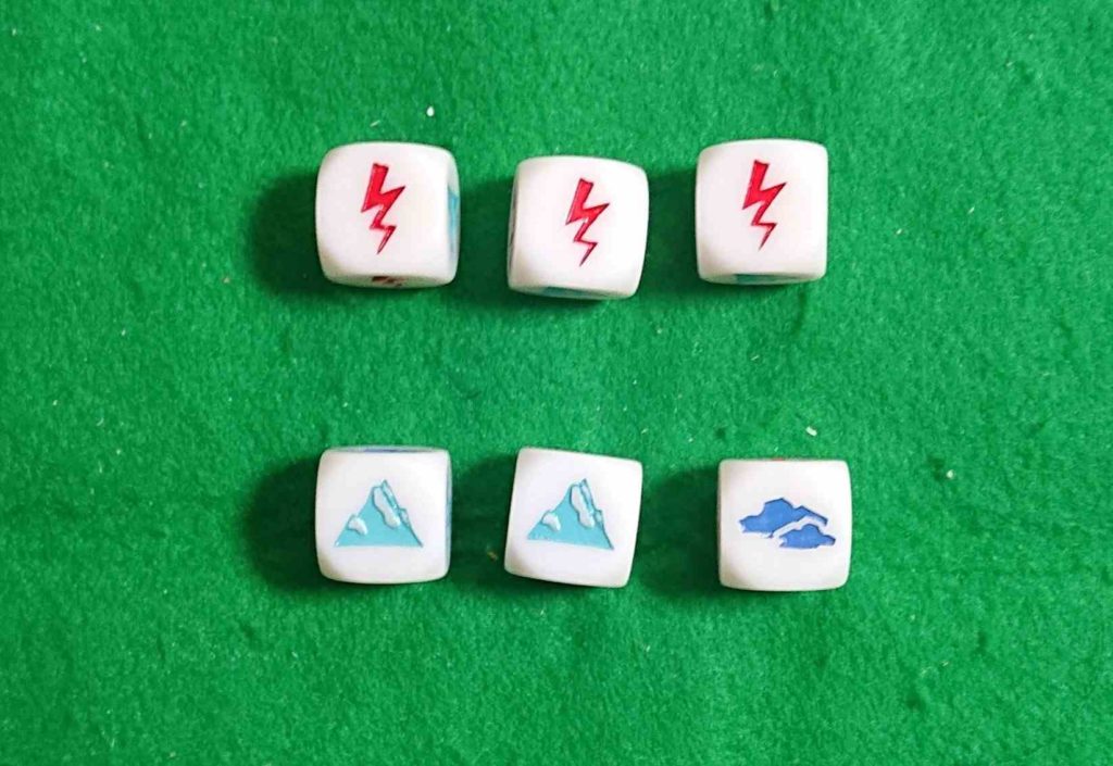 ダイスが6個あります。各ダイスの6面の内3面が赤のカミナリ・2面が薄い青の山・1面が青の雲になっています。