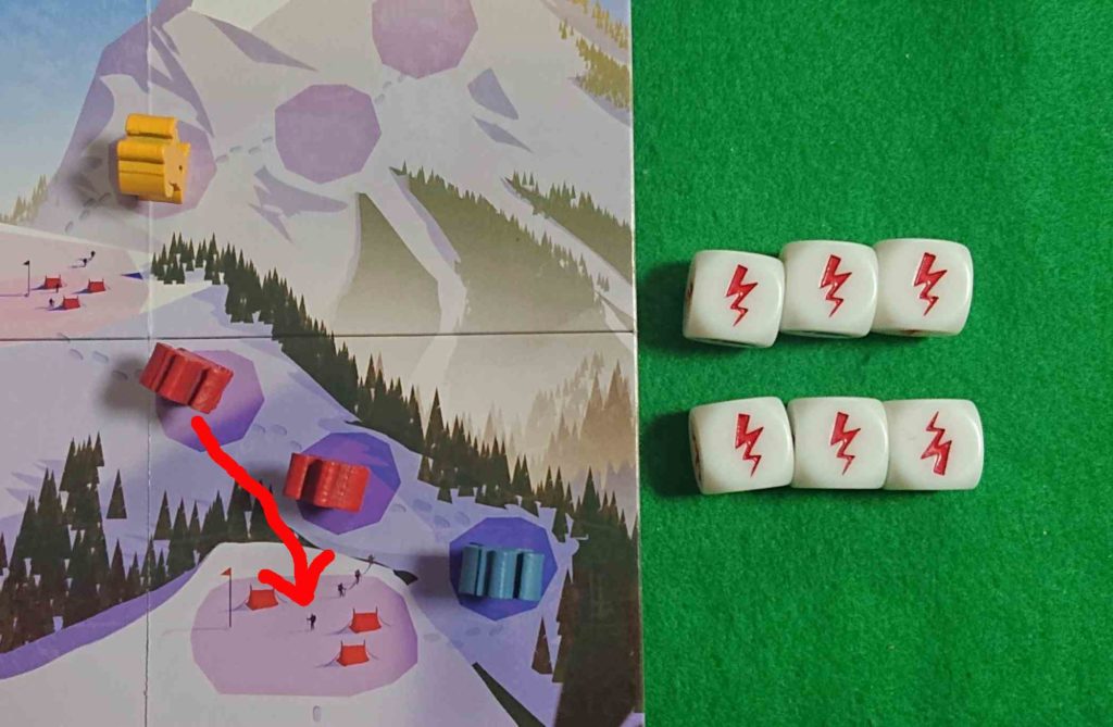 自分の登山者コマを1個選び、ダイスの山の数だけ進めます(雲は関係ありません)。進んだ先が崖でかつ登山者コマが存在した場合は、その登山者コマは下の空いているゾーンに落下します。