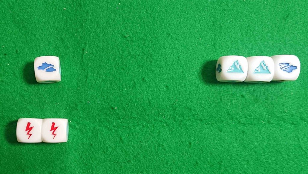 3.カミナリ・山・雲の3種類が出た場合は、山・雲のダイスは脇によけます。再度カミナリのダイスを振る・振らないを決めます。振らない場合はレストとなります。