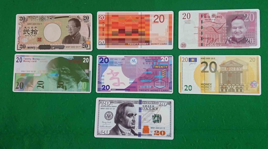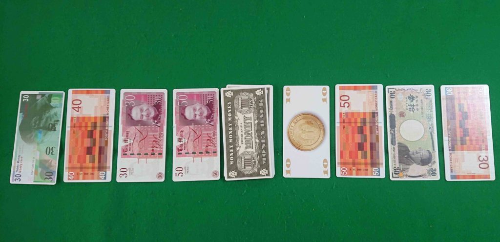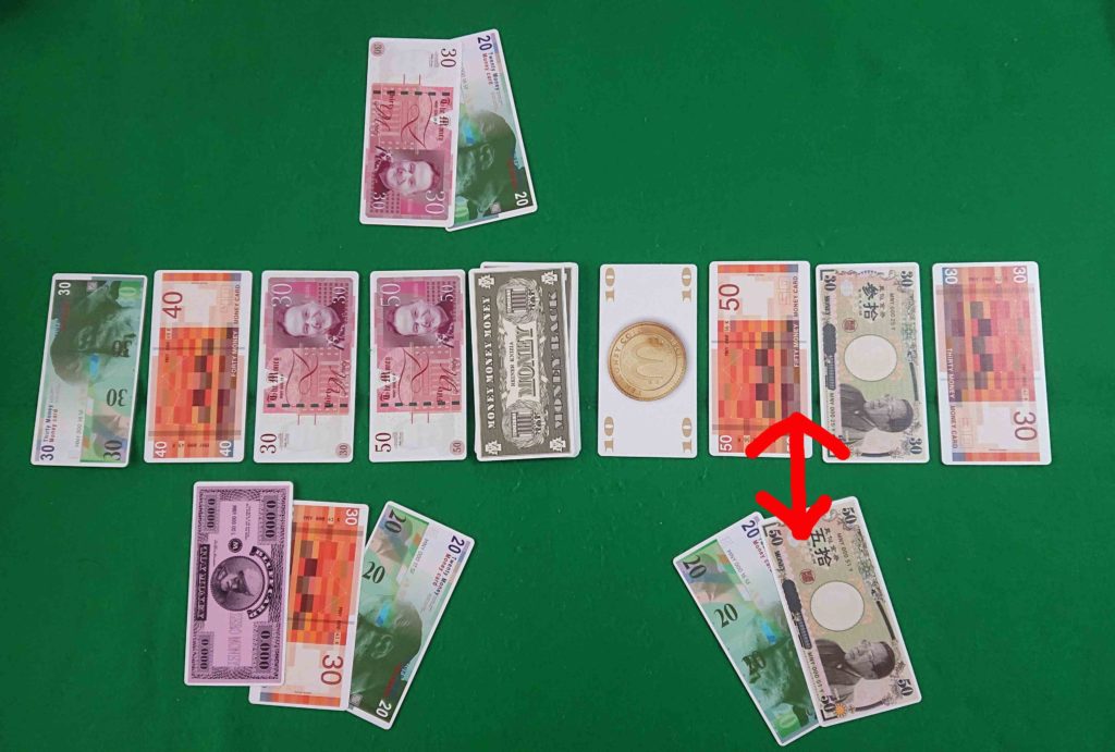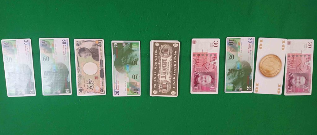 このゲームでは「お金」でお「お金」を競り落としていきます。より合計金額の高い紙幣カードを出したプレイヤーから、為替市場または他のプレイヤーが出した紙幣カードと交換していきます。