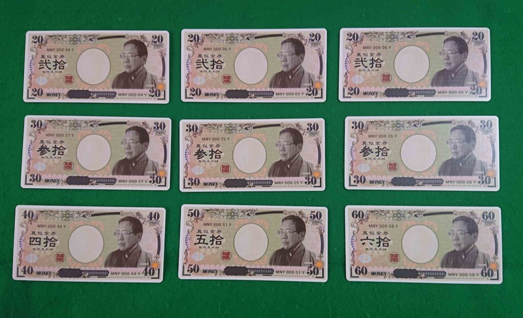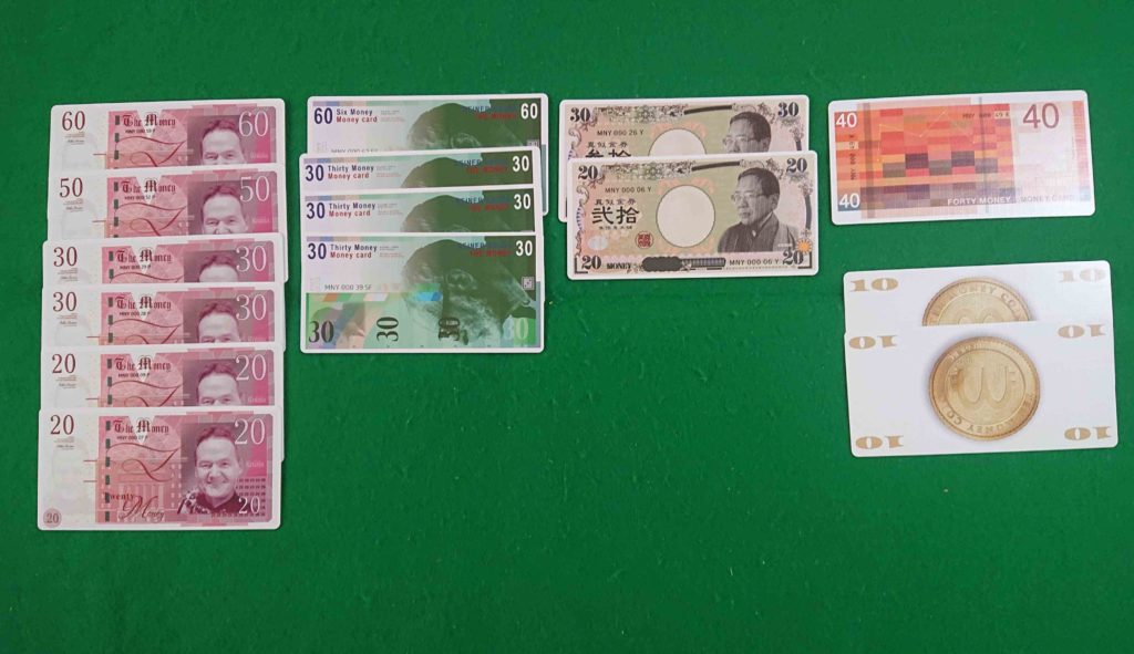 1種類の紙幣カードは、20が3枚・30が3枚・40が1枚・50が1枚・60が1枚の計9枚です。