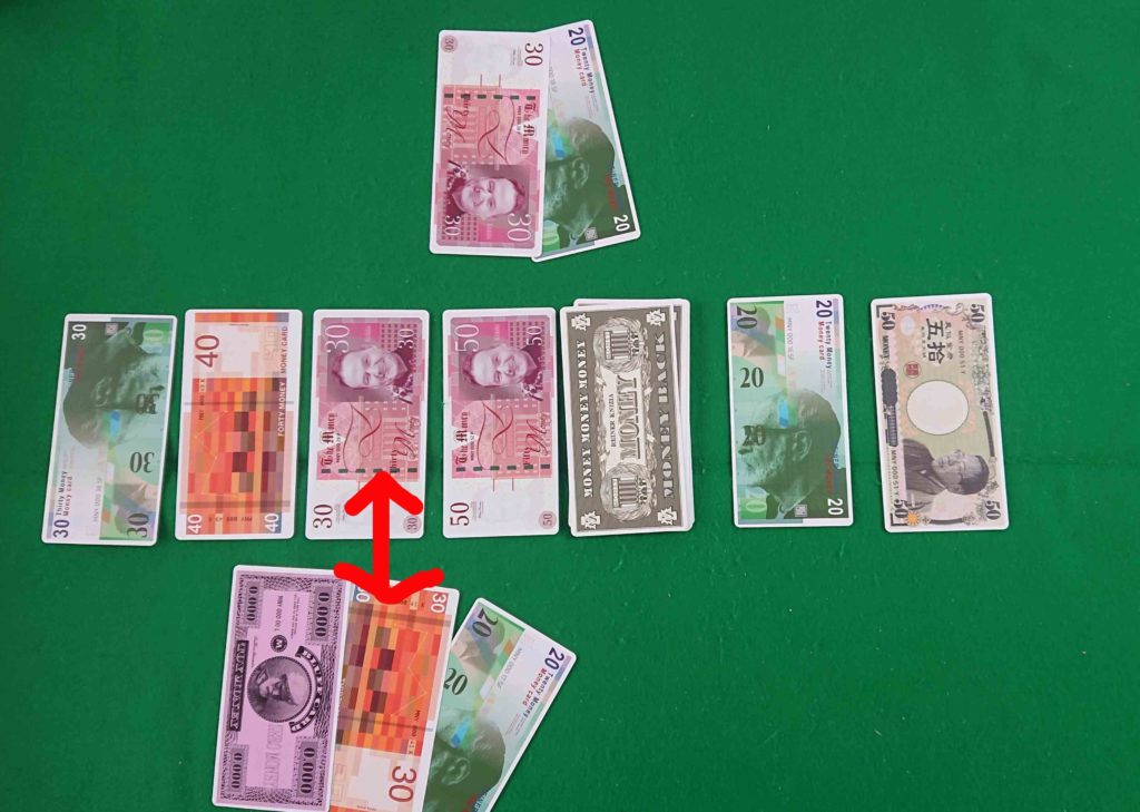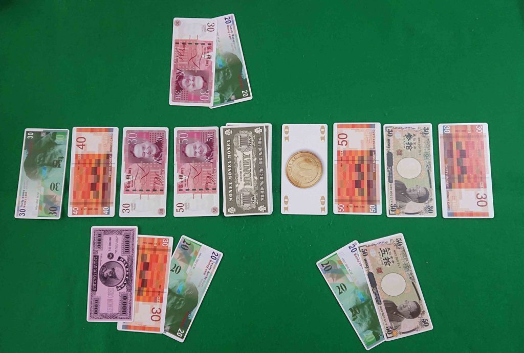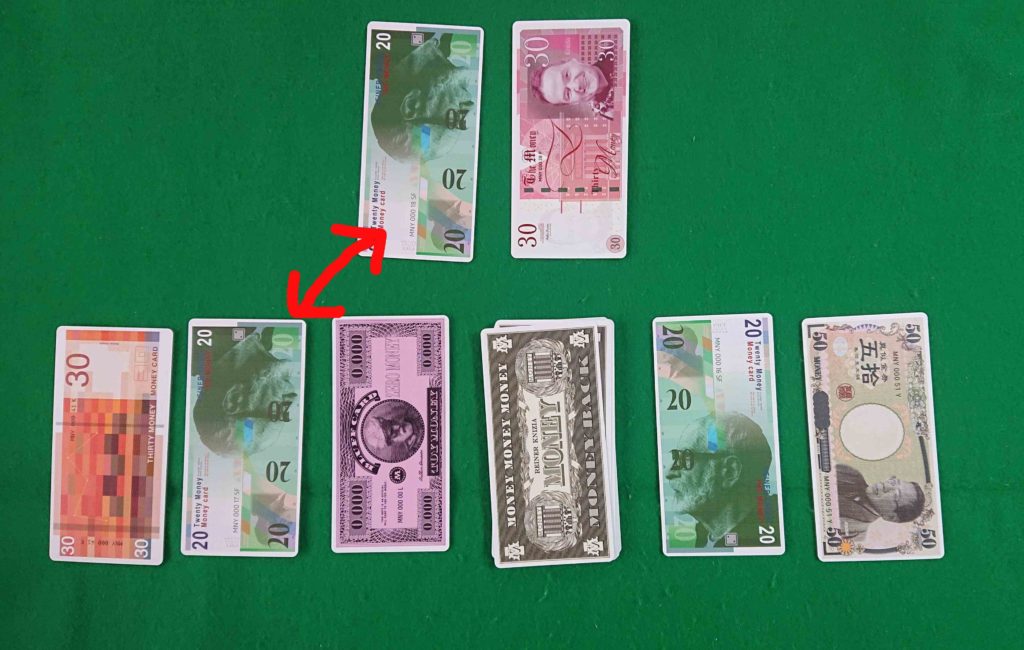 貨幣カード・おもちゃのお金カード・コインカードをよくシャフルして中央に置き、両側に4枚ずつカードを表にして並べます。この両側のカードを為替市場と呼びます。