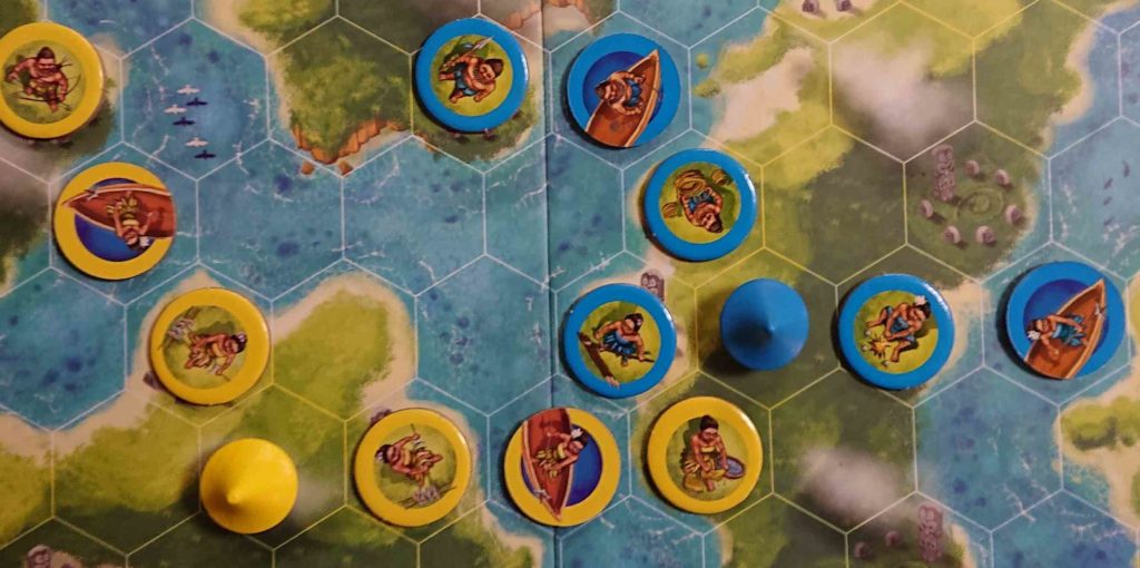 資源コマ・ティキ像コマがすべて取られるか、すべてのプレイヤーの村コマ・部族コマが置かれた場合に前半戦の探索フェーズが終了終了します