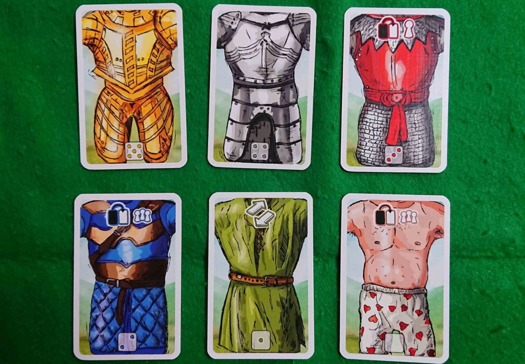 装備カードを混ぜ、裏のまま場に広げ各プレイヤーは兜・鎧・槍・盾・靴の5種類のカードを1枚ずつ取り、自分の前に裏のまま配置します。