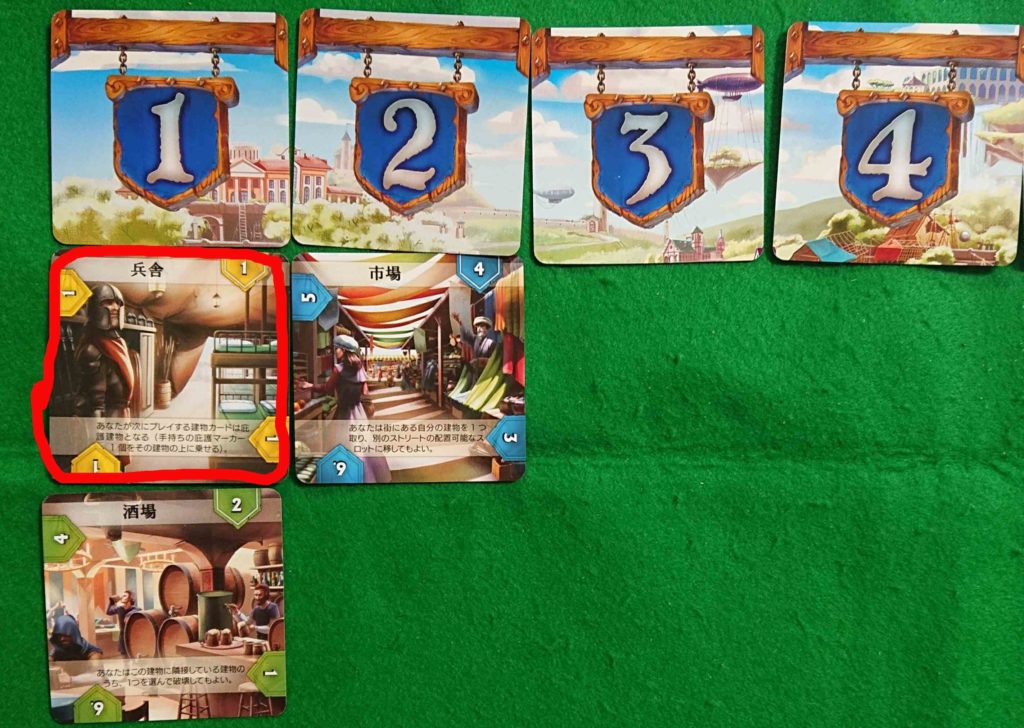 ただし、ストリートはプレイヤーの人数を超えることはありません。よって建物カードは、3人ならば第3ストリートまで、4人なら第4ストリートまでです。