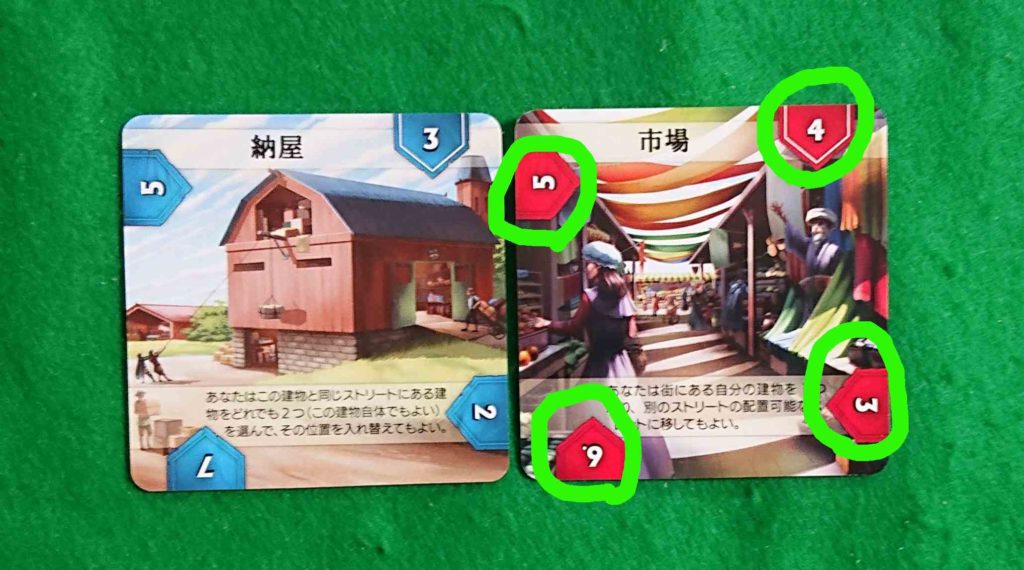 カードを配置したら、左隣のカードと建物価値を比較します。