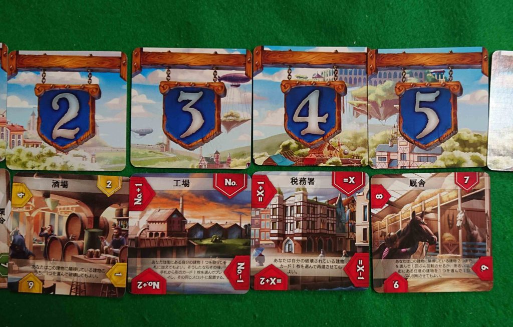 カードを置いて左隣と比較してカードの数字を上げたり下げたりするというシステムのゲームです。価値の比較の後に建物カードの効果を発動させる。