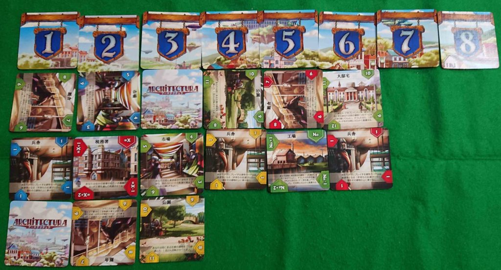 これを繰り返していき、街に建物を配置できなくなったらゲーム終了です。各プレイヤーの建物カードの価値を合計して、最も価値の高いプレイヤーの勝利です。