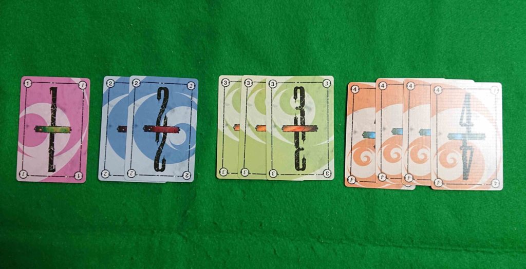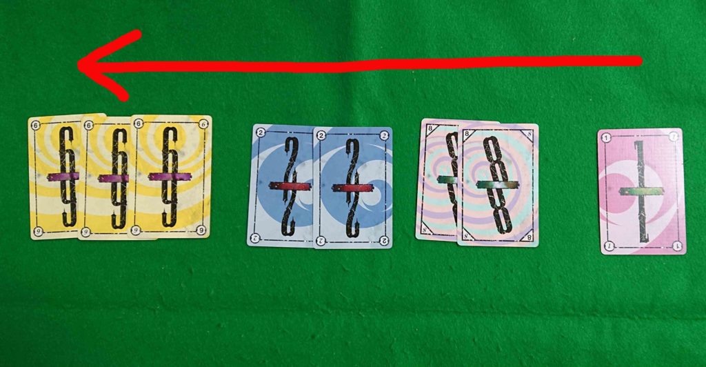 そうなってくると、数字の1は1枚・数字の2は2枚しか無いわけですから3枚出し4枚出しが出来ないのでだんだん価値が(強さが)下がっていくのです。ゲームの途中で少しずつカードの価値が変化していくのがこのゲームのポイントなのです!