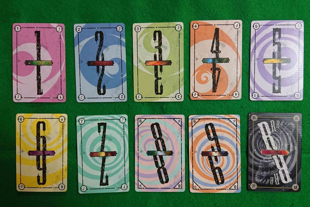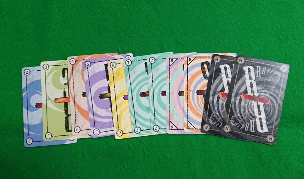 1から9までの数字のカードとRと描かれたカードの計57枚あります。