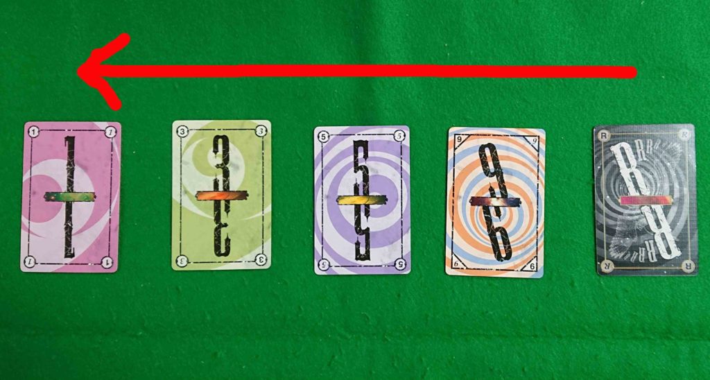 手札が無くなったプレイヤーは、その時場に出ていたカードを手札に加えないで、裏のまま自分の前に置きます。これで最終ラウンドであることを示します。