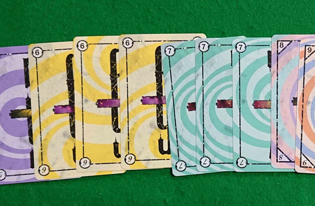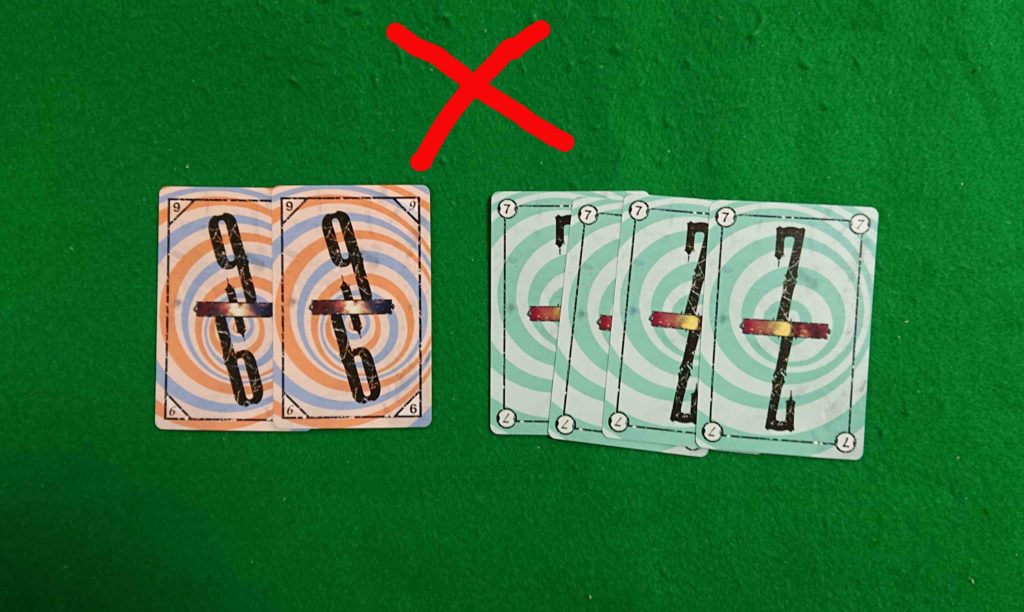 あと、面白い点は、後半にせっかく揃っていても場に出ているカードの枚数+1枚しか出せないのが効いています。