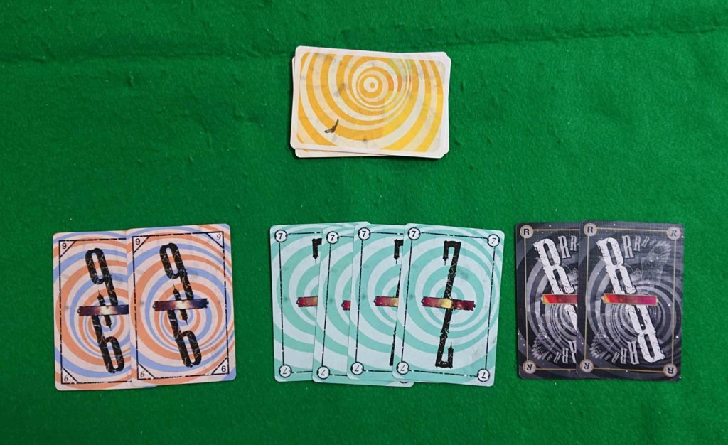 しかし、ゲームが進んでいくと各プレイヤーの手札は、少しずつ同じ数字のカードが増えていくのです。何故なら、場にある2枚とか3枚の同じ数字を手札に入れていくのですから・・・。