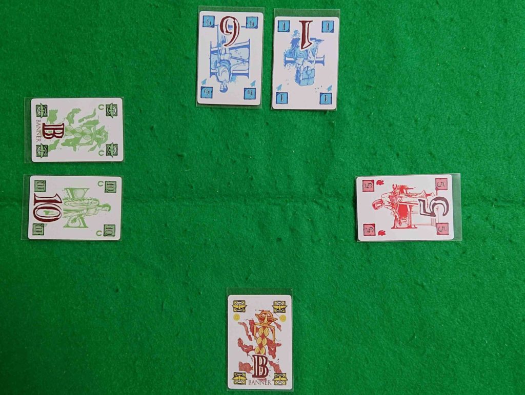 1が最強のカードですが、他のプレイヤーが追加で旗カードを出さないかを確認してトリック終了です。手札に旗カード残さないために1の数字カードの後に旗カードを出すことも出来ます。