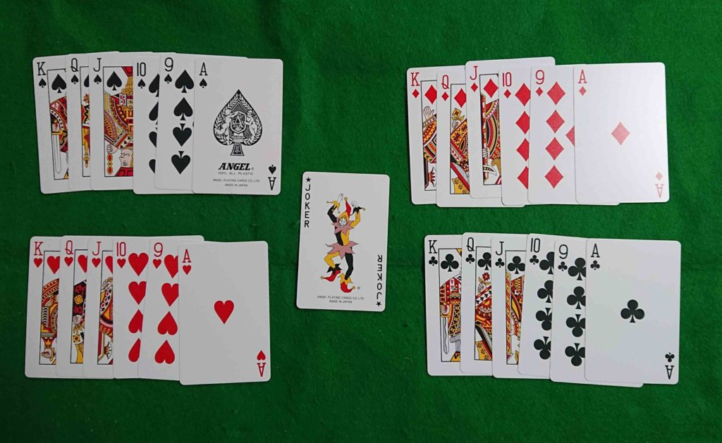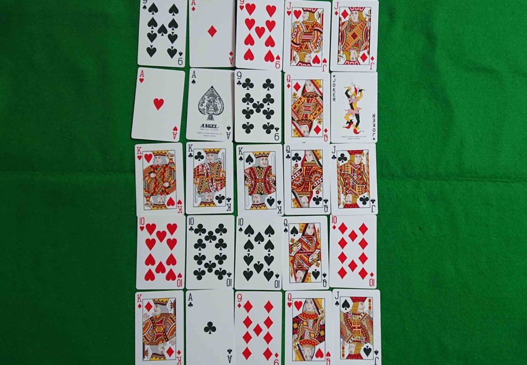 トランプの各スートの9から13と1の6枚のカード計24枚とジョーカー1枚を使用します。