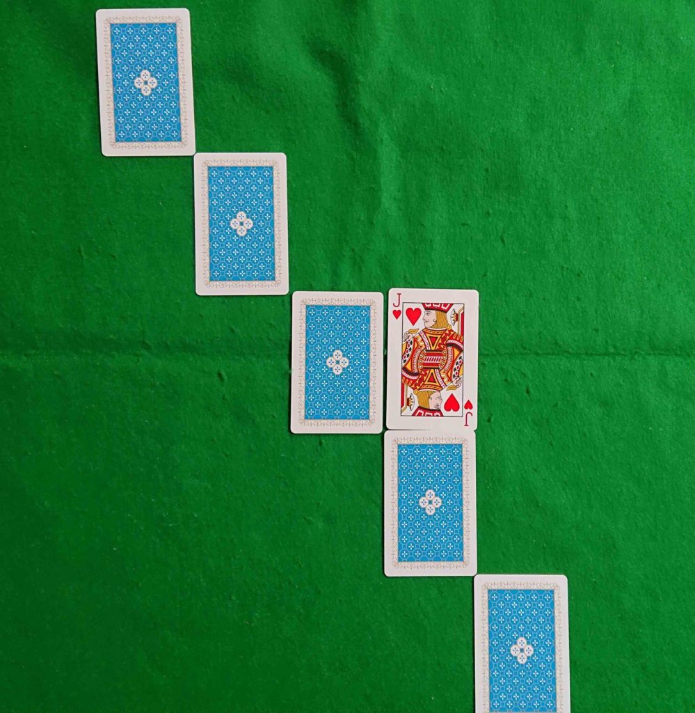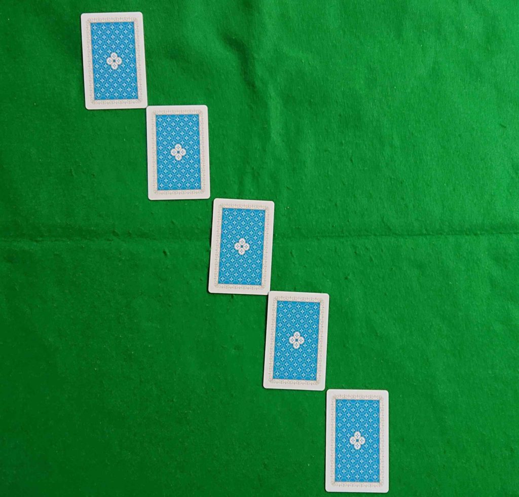 カードをよくシャフルして、5枚を裏向きに斜めに接せるように配置します。