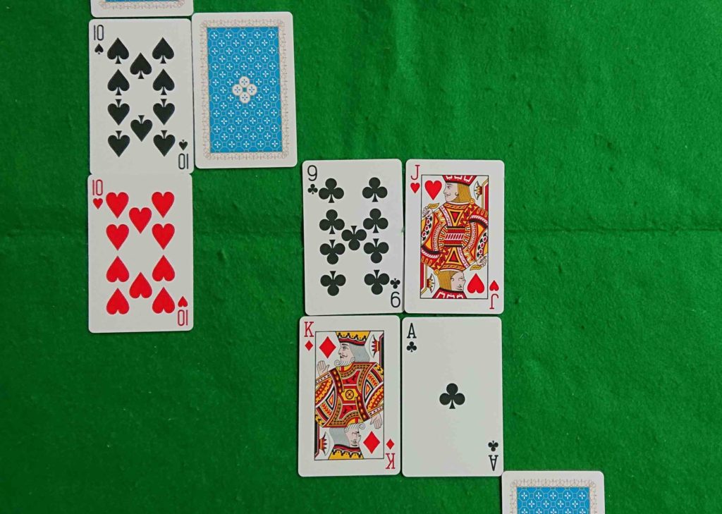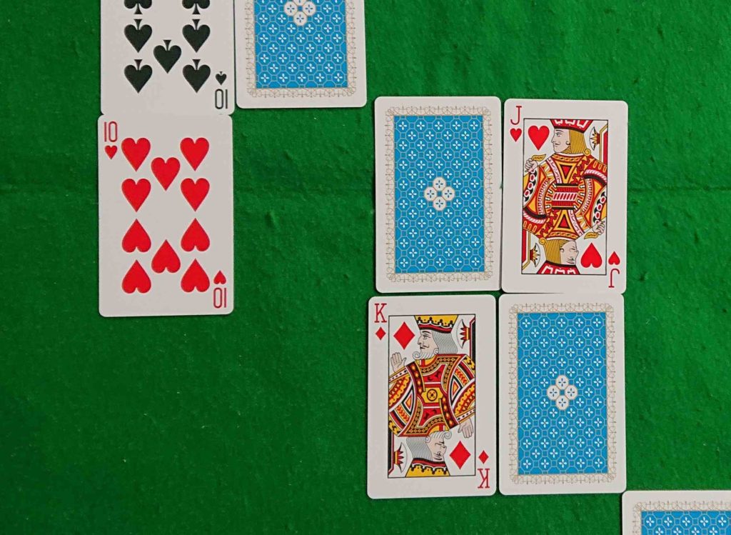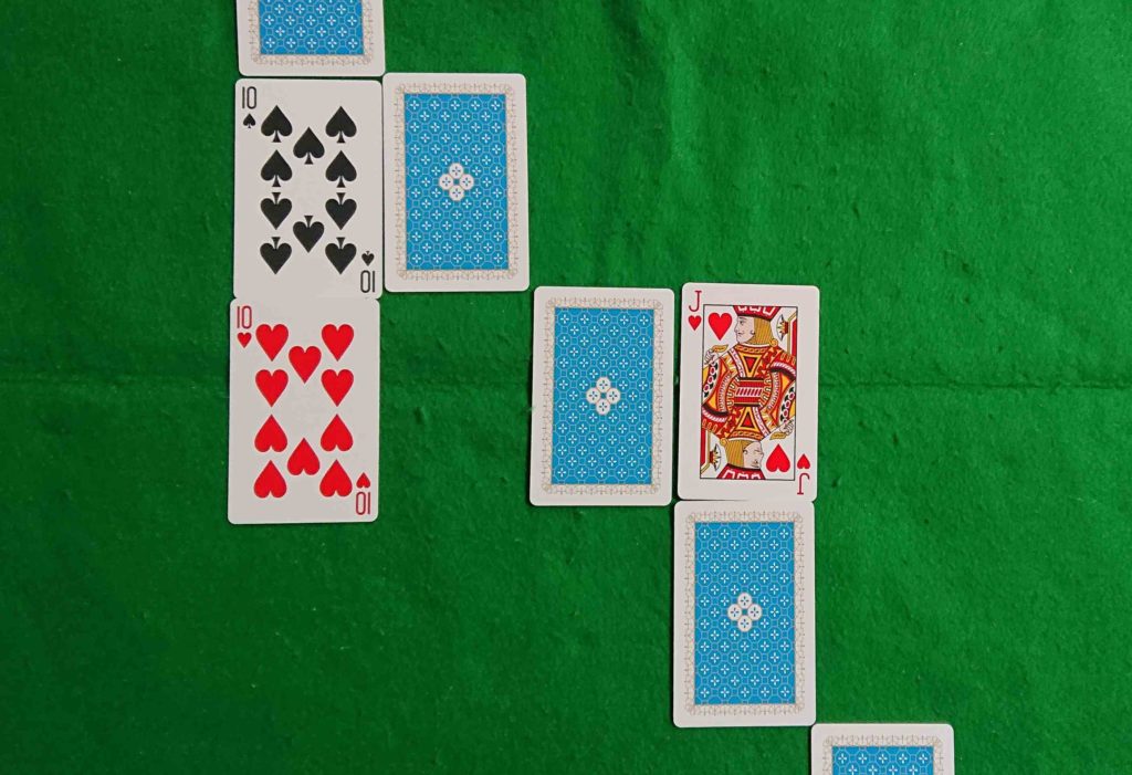 場に5枚のカードを裏向きに置き、お互いにトランプの手札を10枚ずつ持って、カードを1枚ずつ配置していきます。各プレイヤーの1人は縦方向にポーカーの役が出来るようにしていき、もう1人は横方向にポーカーの役を作っていきます。