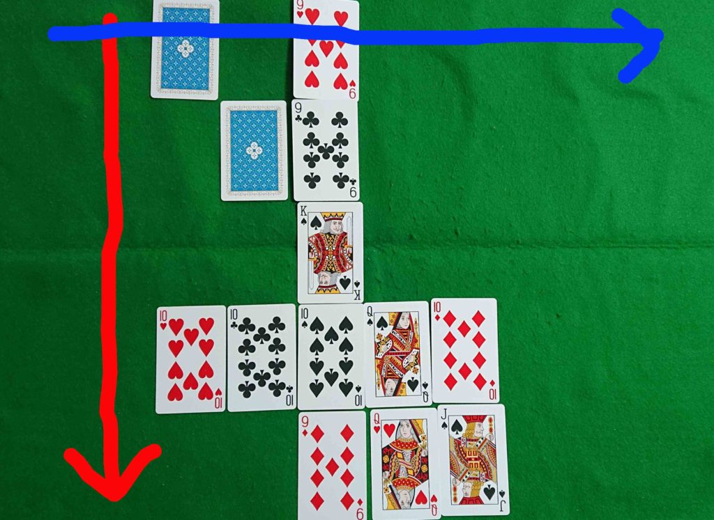 ゲームの目的は、1人のプレイヤーは縦方向(赤い矢印)にポーカーの役を作っていき、もう1人は横方向(青い矢印)にポーカーの役を作っていくことです。