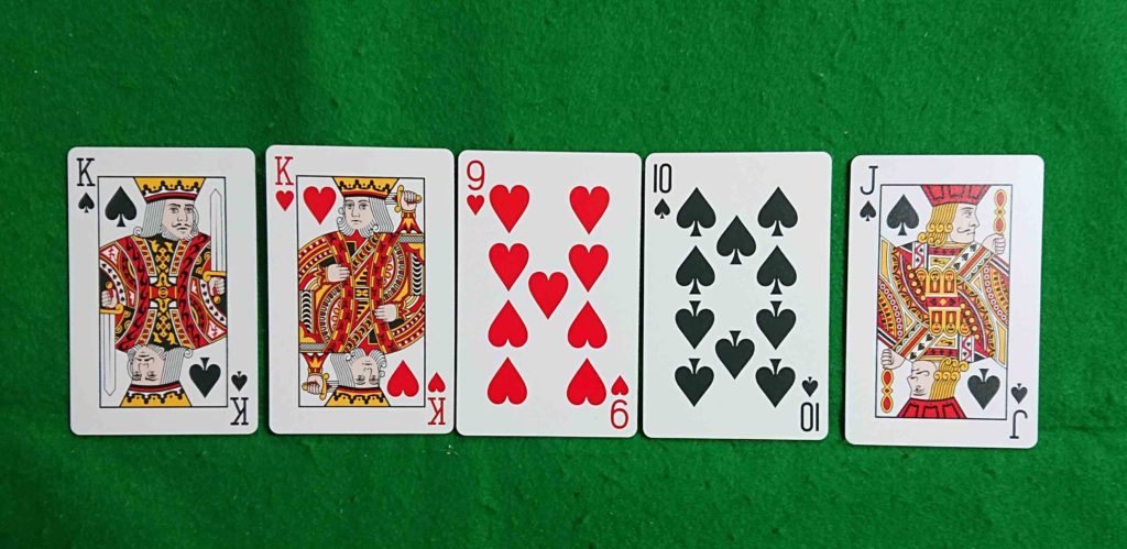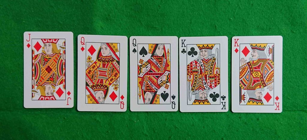 例えば下の写真の場合は、2ペアの2点に、すべて絵札なのでクランとなり追加の3点が加わり5点です。