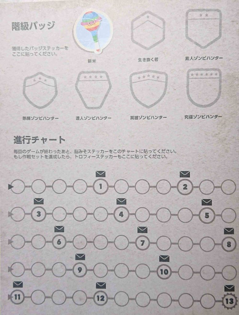 このゲームはこれで終わりではありません!ゲーム終了ごとにシール貼っていき、ある回数を超えると新しいルールや新しいキャラクターが登場したり、キャラクターの能力・ゾンビの能力が進化していくのです!