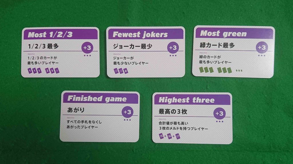 また、各ボーナスカードの条件を満たしたプレイヤーは3点もらえます。