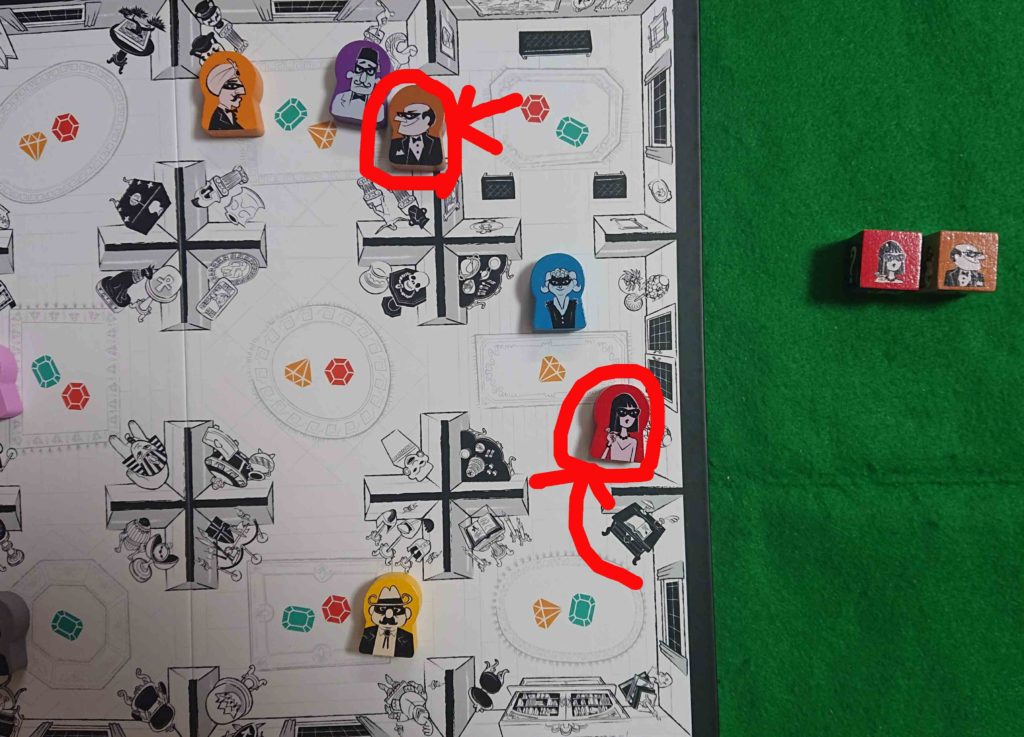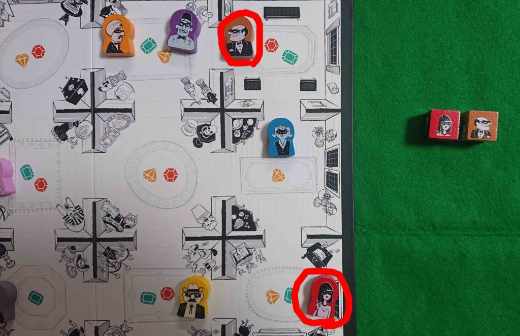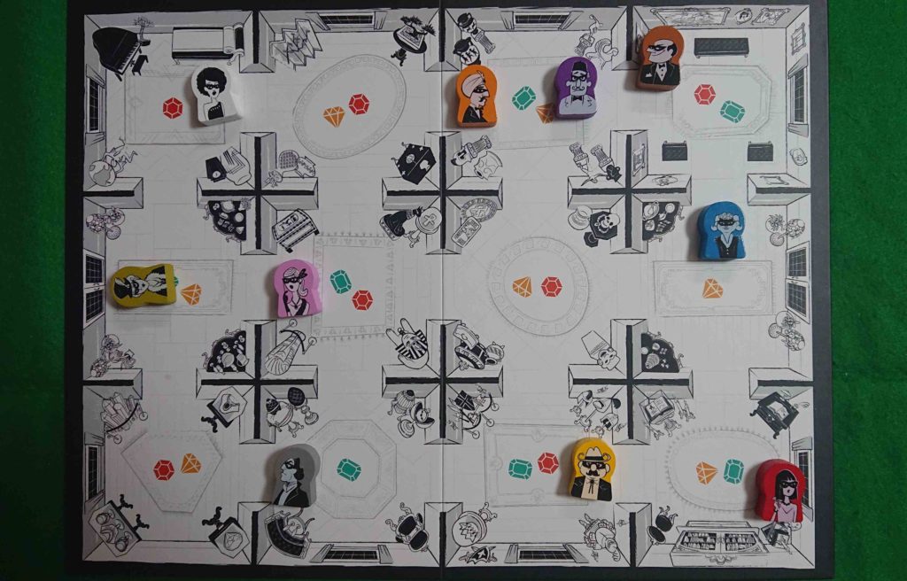 各プレイヤーは10人にゲストの1人となり邸内の宝石を盗んでいきます。サイコロを振って、ゲストコマを2個動かした後に、アクションカードを1枚プレイして、アクションを2回行います。