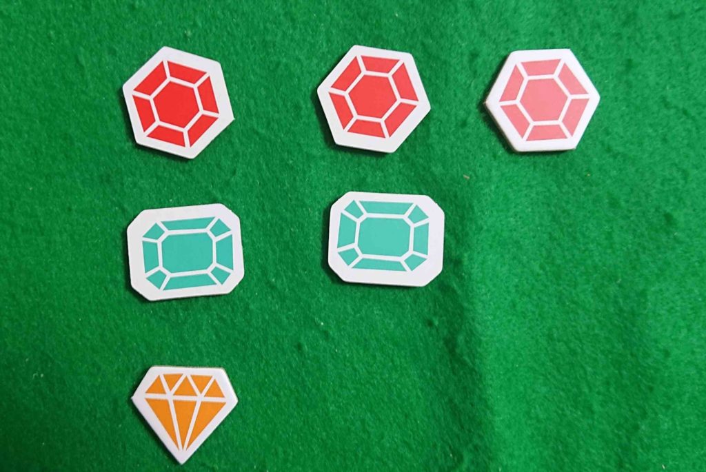 宝石トークンです、ダイヤ(黄)・エメラルド(緑)・ルビー(赤)の3種類あります。
