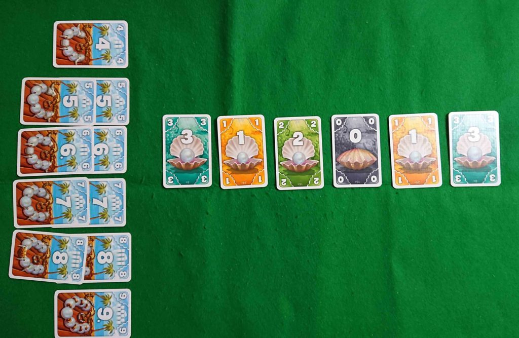 ネックレスカードを数字ごとに並べて置きます。真珠カードをよくシャフルして、各プレイヤーに6枚ずつ配ります。その後、6枚を場に並べます。