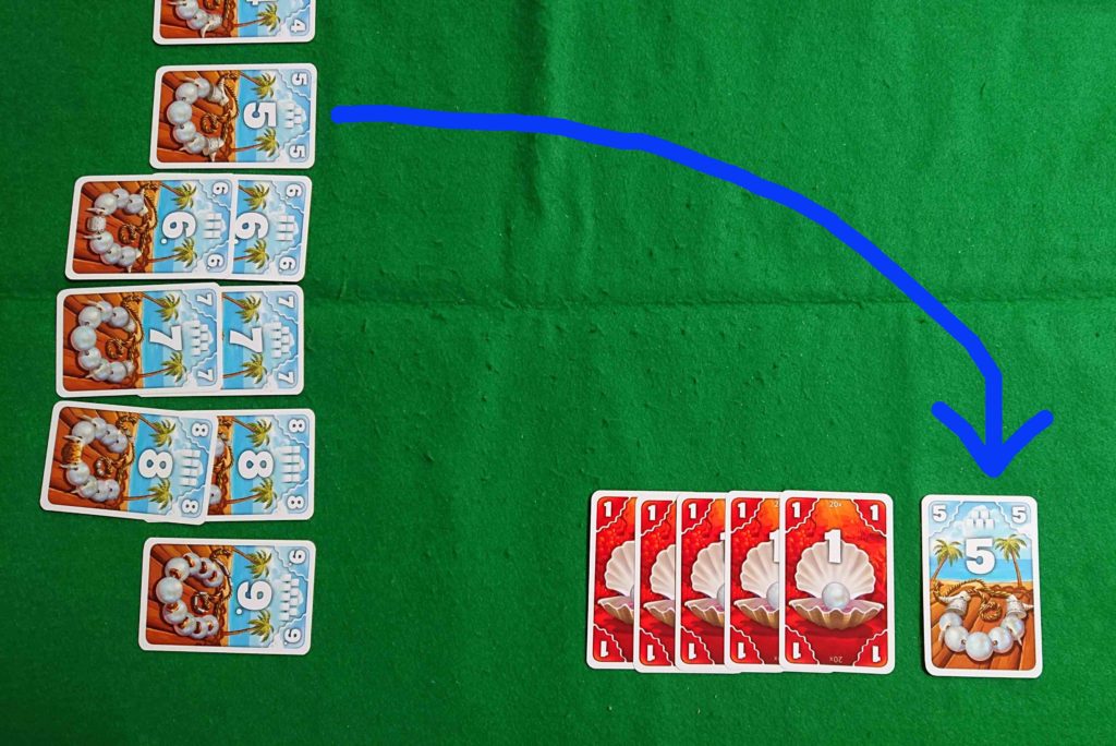 カードを取る代わりに、手札から1枚以上同じ色の真珠のカードを場に出して自分の前に置きます。