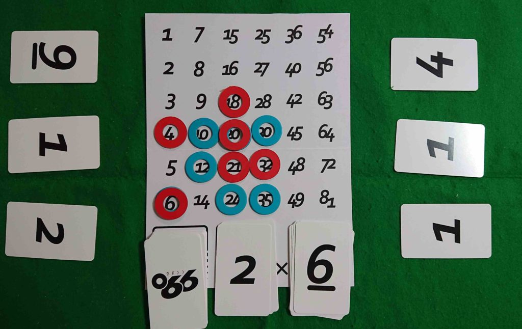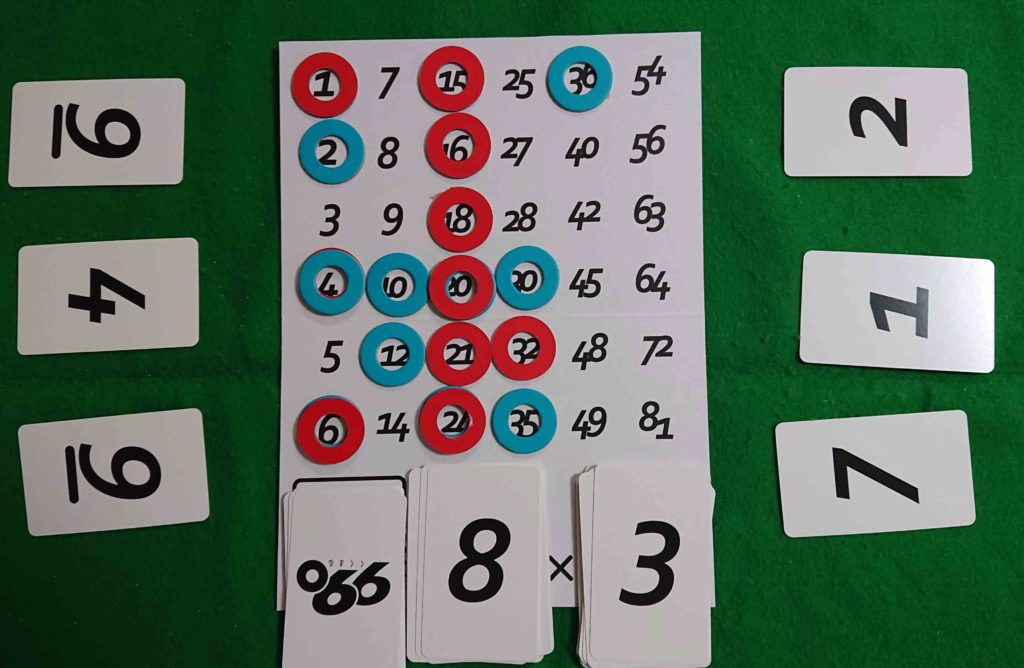 お互いに手札の3枚から中央のボード上に数字カードを1枚または2枚置きます。その数字を掛けて、ボード上の同じ数字の場所に自分の色のコマを置きます。これを交互に繰り返します。