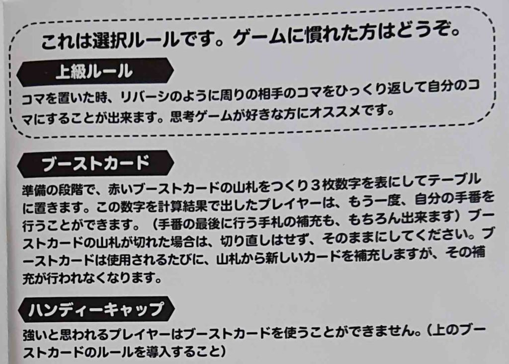 また、選択(上級)ルールとして、オセロのように挟んだら裏返すとかもあります。また、下の写真のブーストカードを使用するルールもあります。