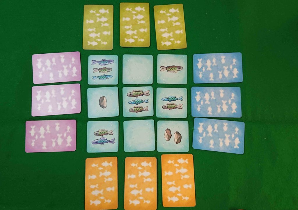 池カードを1マス自由に動かして重ねることを1回ずつ繰り返します。その後、釣竿カードを表にして、釣竿が描かれている列の池カードをすべて獲得します。