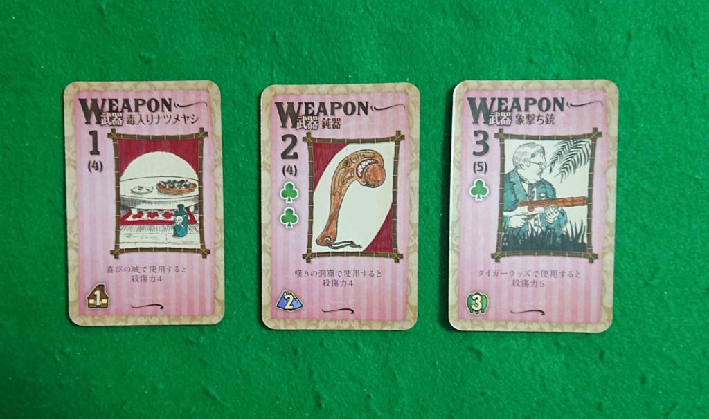 武器カードです、左上の数字は殺傷力です。殺害する場所によって殺傷力が上がります。