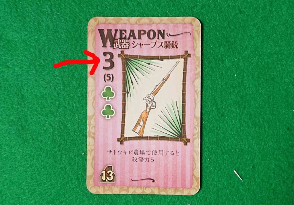 下の写真の場合は、武器カードの殺傷力が3です。よってプレイヤーの殺傷力1の分と合わせて殺傷力4となります。Drラッキーがサトウキビ畑にいる場合にこのカードを使用すると殺傷力5になります。