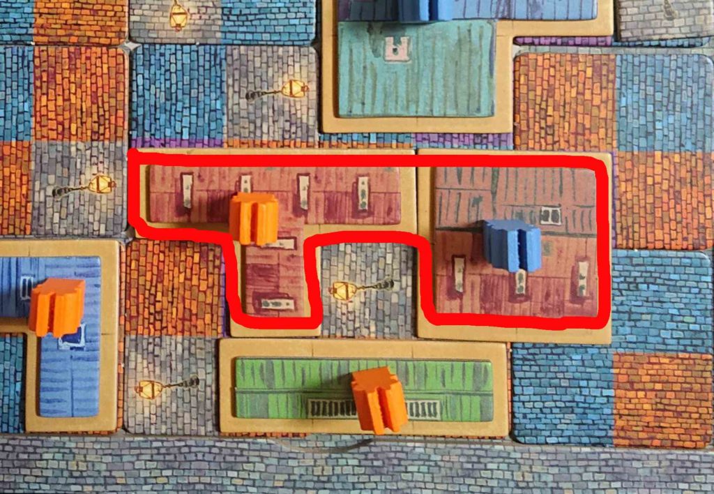 ゲーム終了後、「建物タイルの数×建物に接する街灯の数」と「1番大きな建物グループのタイルの数」が得点になります。残った建物タイル1個に付き3点減点です。