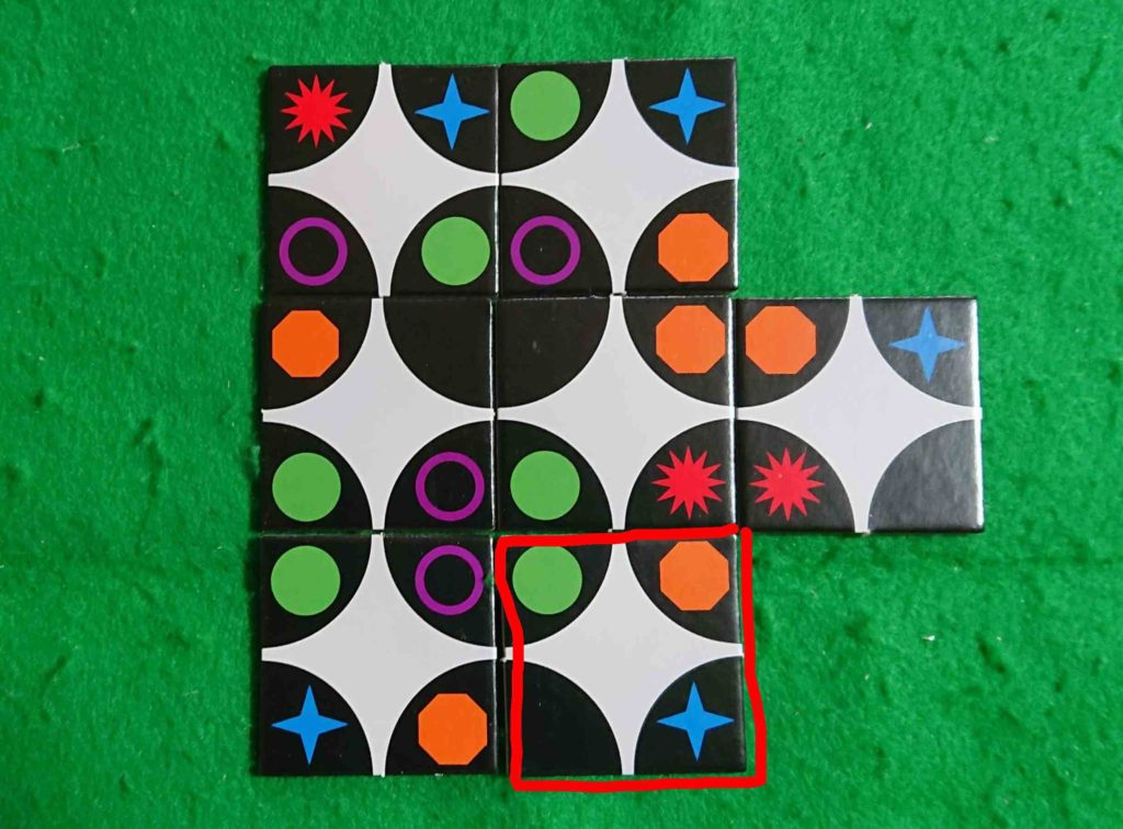 下の写真の場合は、配置したタイルの緑の部分が同じなので、まず緑1点を獲得します。シンボルがない黒い部分の隅は、自分が好きな色を選んで構いません。(シンボルを指定できるのは自分が今配置したタイルだけです!)