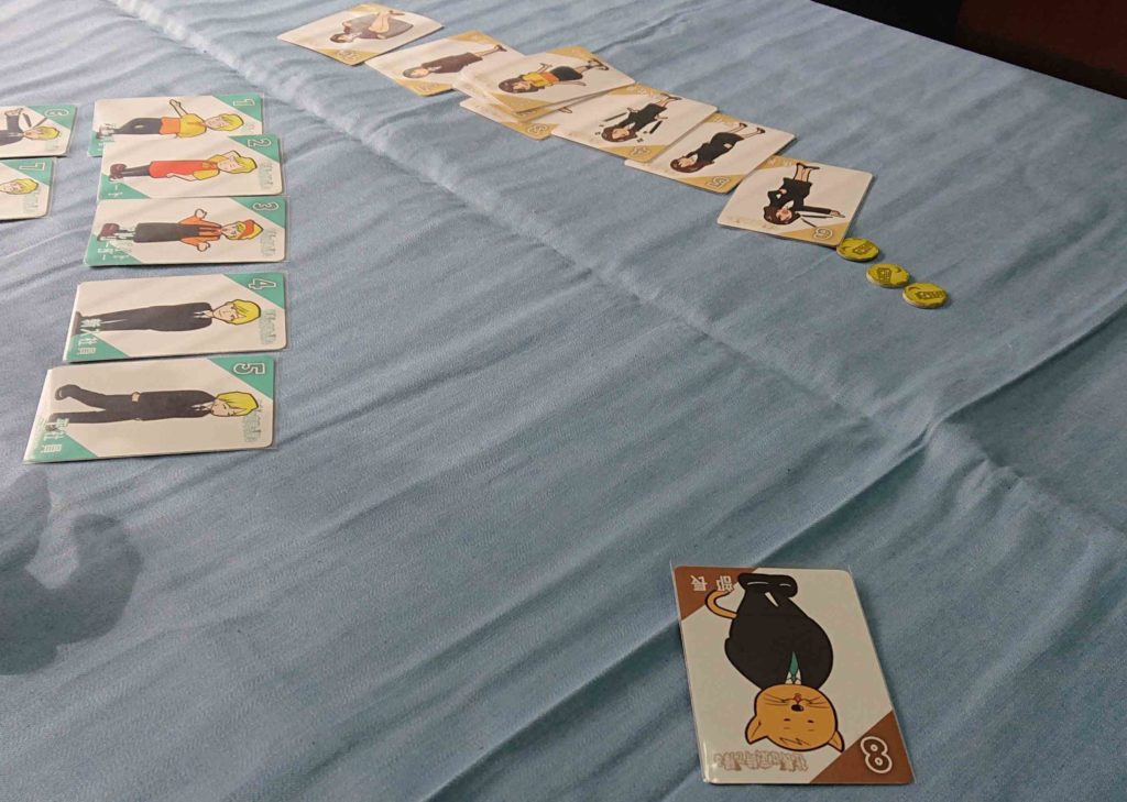 下の写真の場合は、8の数字を出したプレイヤーが7の数字のカードを出したプレイヤーに残業を押し付けます。8カードのは捨て札となり7のカードは手札に戻ります。7のカードを出したプレイヤーは残業コインを1個獲得します。
