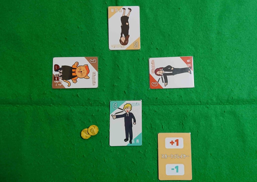 各プレイヤーは10枚の社員カードを受け取り、5から10までは数字順に表にして山札とします。1~4までの社員カードを手札とします。