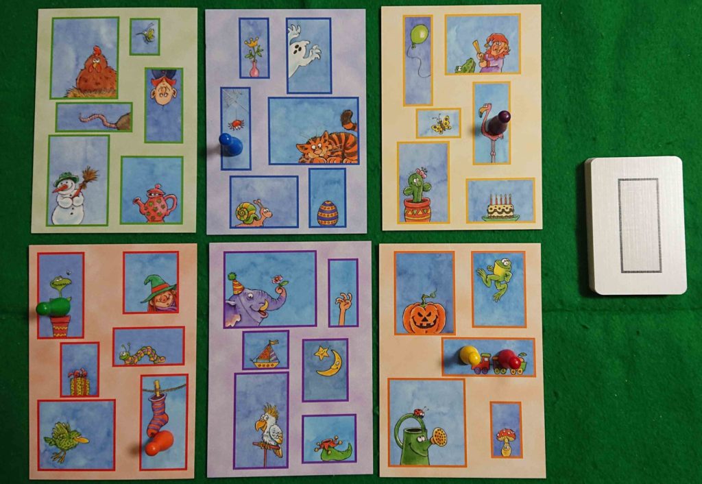 窓の絵ボードが6枚を並べます。窓枠カードの白い枠の方を上にして良くシャフルして山札として置きます。