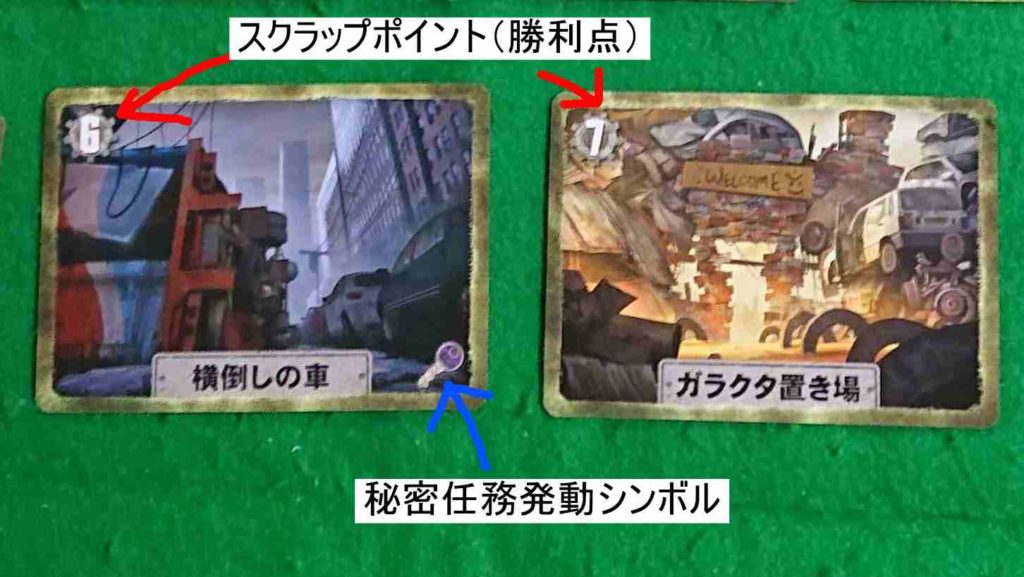 たてものカードにはスクラップポイント(勝利点)があり、戦闘で勝利するとたてものカードを獲得できます。